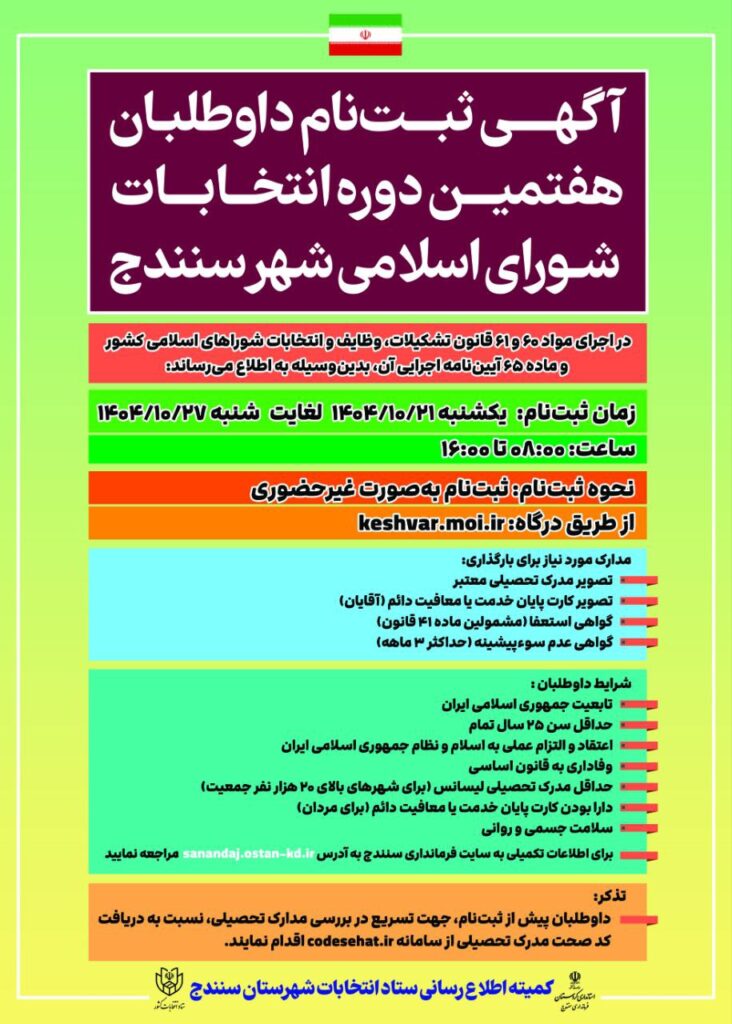 ۱۴۰۴/۱۰/۲ثبتنام از داوطلبان این دوره از انتخابات از روز یکشنبه ۲۱ دی ماه آغاز و تا پایان روز شنبه ۲۷ دی ماه به مدت ۷ روز ادامه خواهد داشت