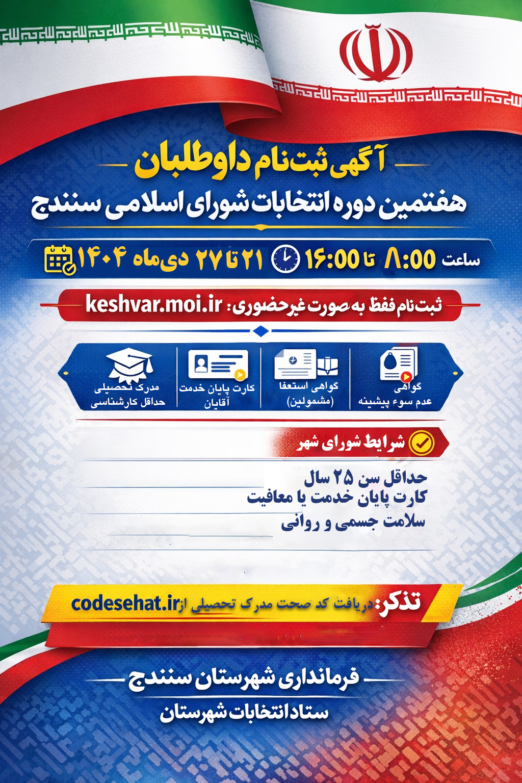 فرم آگهی ثبت نام از داوطلبان انتخابات شورای اسلامی شهرهای سنندج، شویشه و حسین‌آباد منتشر شد